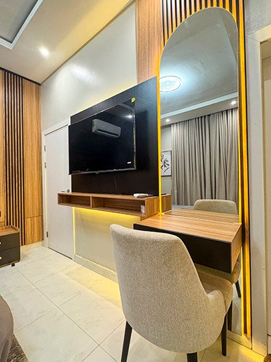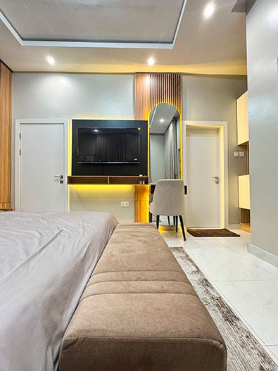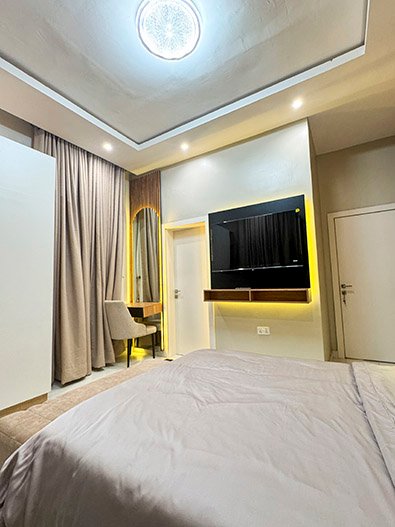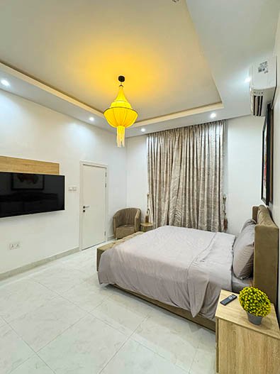 Stay at Divinity, Jemi Court Residence. Deluxe 2-bedroom shortlet in Surulere, Lagos with 24/7 power, Wi-Fi, Netflix. Nightly & extended stays.